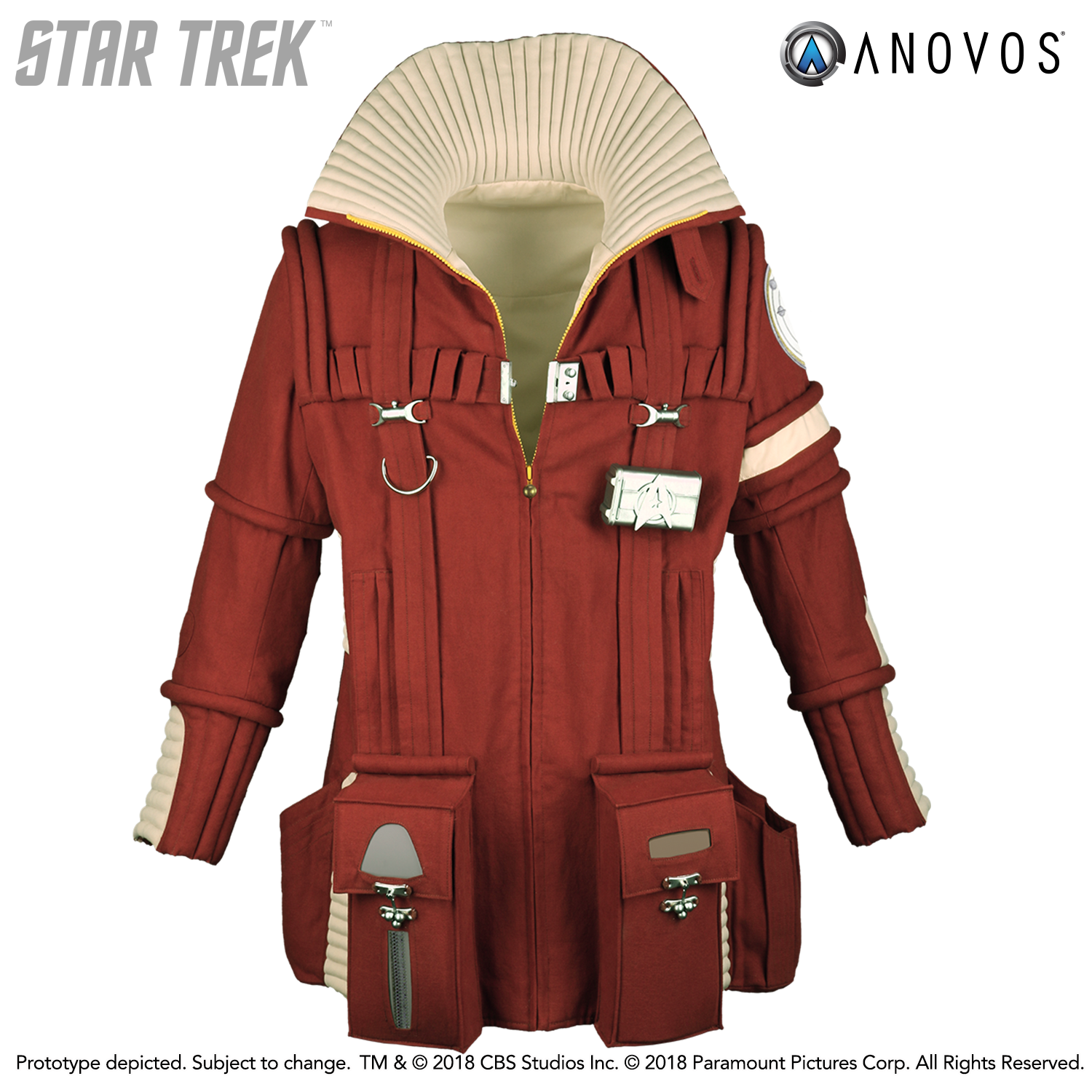 With direct lineage from the landing party field jackets shown in "The Cage" and STAR TREK: THE MOTION PICTURE, the succeeding iteration of the Starfleet Landing Party Field Jacket featured in STAR TREK: THE WRATH OF KHAN replicates the one worn by Admiral James T. Kirk when investigating the Regula One station.